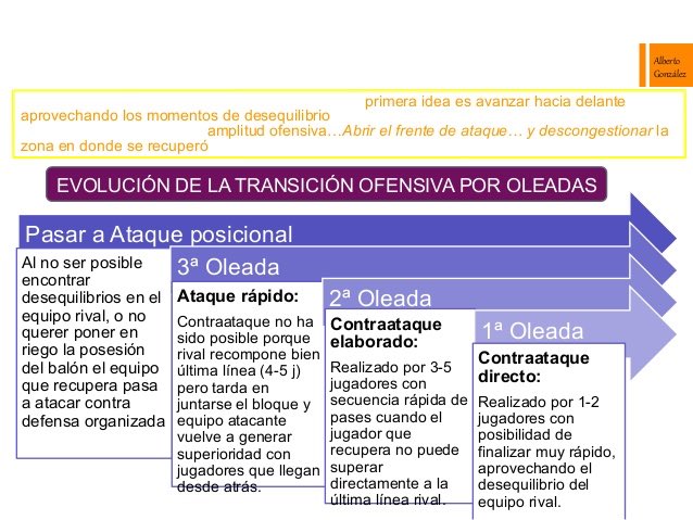 ここでカウンターアタックと速攻が区別されているが、前者はDFラインが整う前の攻撃であり、前線の1、2枚で素早く攻撃する直接的なものと2列目の選手も絡むコレクティブなものをさらに区別することもできる。一方後者は、DFラインは組織化できたものの中盤の組織化が整っておらず攻撃に晒されている状態である。
